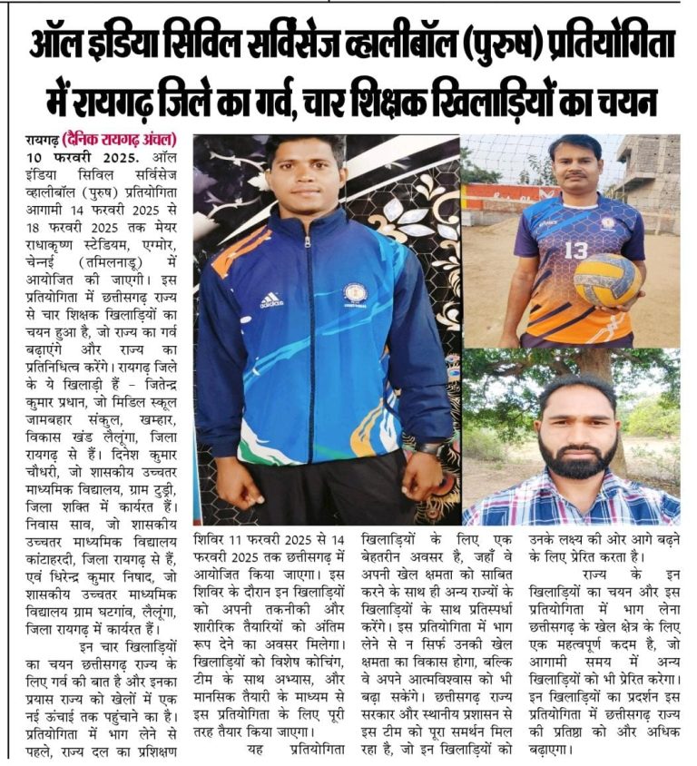 ऑल इंडिया सिविल सर्विसेज व्हालीबॉल (पुरुष) प्रतियोगिता में रायगढ़ जिले का गर्व: चार शिक्षक खिलाड़ियों का चयन रायगढ़ - ऑल...