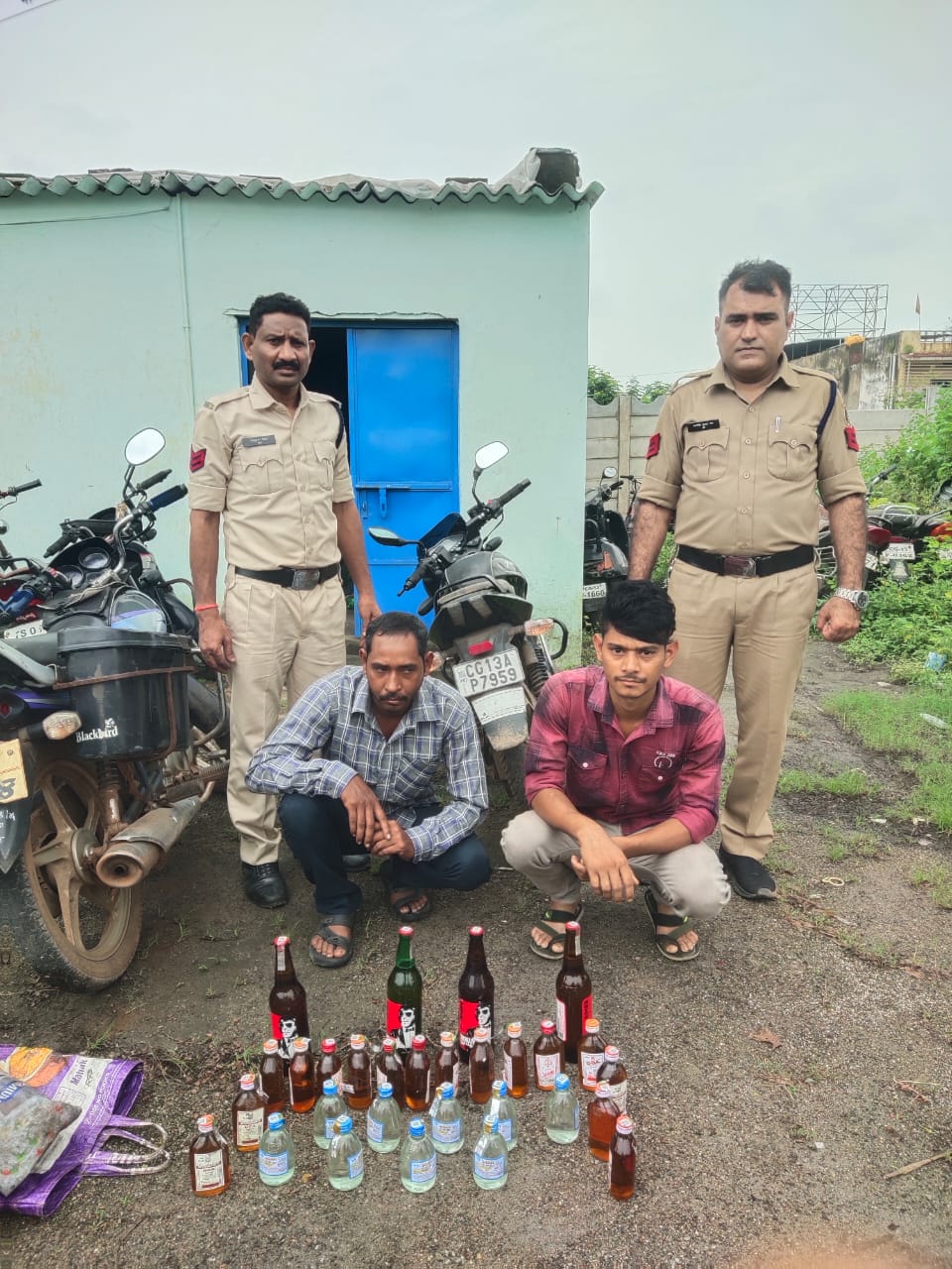 गिरफ्तार किए गए आरोपियों की पहचान गोपीराम साहू (32 वर्ष) निवासी डुगरपाली, थाना भूपदेवपुर, और नागेश्वर साहू (25 वर्ष) निवासी सकर्रा, थाना मालखरौदा, जिला सक्ती के रूप में हुई है। पुलिस ने आरोपियों के पास से 12 पाव देशी प्लेन मदिरा, 04 पाव जम्मू अंग्रेजी शराब, 04 नग 650 ML शिम्बा बियर, 08 पाव गोल्डन गोवा अंग्रेजी शराब (*कुल 28 पाव शराब/बियर-₹3,000*) और शराब परिवहन में प्रयुक्त एक काले रंग की बजाज पल्सर मोटरसाइकिल (क्रमांक CG 13 AP 7959) जप्त की, जिसकी कुल कीमत 1,10,000 रुपये आंकी गई है।