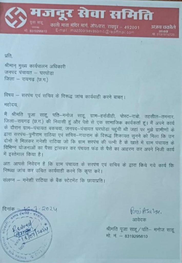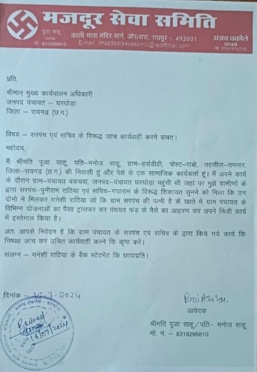 घड़घोड़ा — रायगढ़ जिले के घरघोड़ा जनपद पंचायत में एक गंभीर अनियमितता का मामला सामने आया है, जिसमें ग्राम पंचायत के सरपंच पुनिराम राठिया और सचिव गया राम पर पंचायत फंड के दुरुपयोग का आरोप लगाया गया है। यह मामला तब प्रकाश में आया जब सामाजिक कार्यकर्ता पूजा साव ने इस अनियमितता के खिलाफ घरघोड़ा जनपद के सीईओ को लिखित शिकायत दी और मामले की जांच की मांग की।