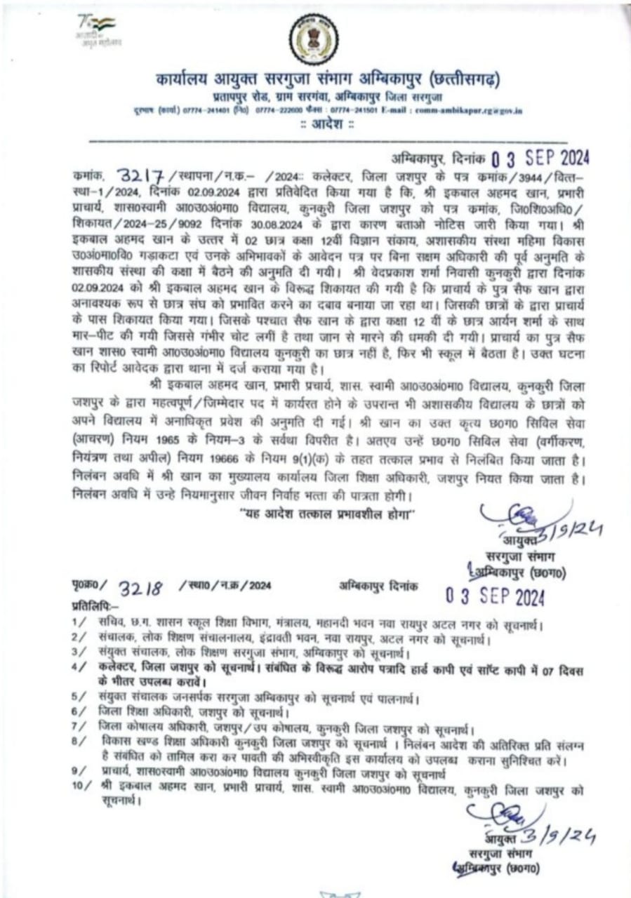 प्रभारी प्राचार्य इकबाल अहमद खान के इस कृत्य को छ०ग० सिविल सेवा (आचरण) नियम 1965 के नियम-3 के सर्वथा विपरीत मानते हुए है उन्हें छ०ग० सिविल सेवा (वर्गीकरण, नियंत्रण तथा अपील) नियम 19666 के नियम 9 (1) (क) के तहत तत्काल प्रभाव से निलंबित किया गया
