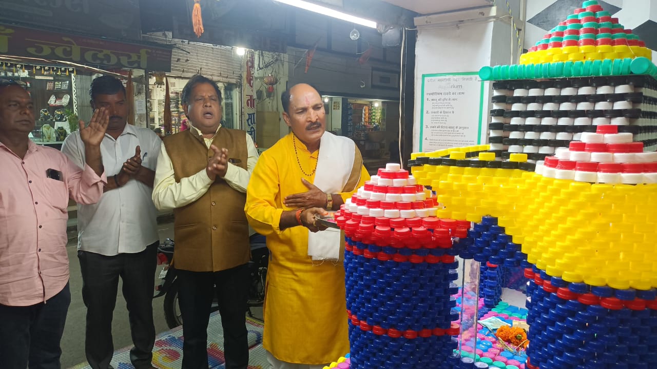 इस बार गणेश चतुर्थी पर्व पर अमित ने वाटर बॉटल के ढक्कन से गणेश जी का दरबार सजाया है जिसमें करीब चार हजार से ऊपर वाटर बॉटल के प्लास्टिक ढक्कनों को जोड़कर गजानन महाराज का भव्य दरबार बनाया है।