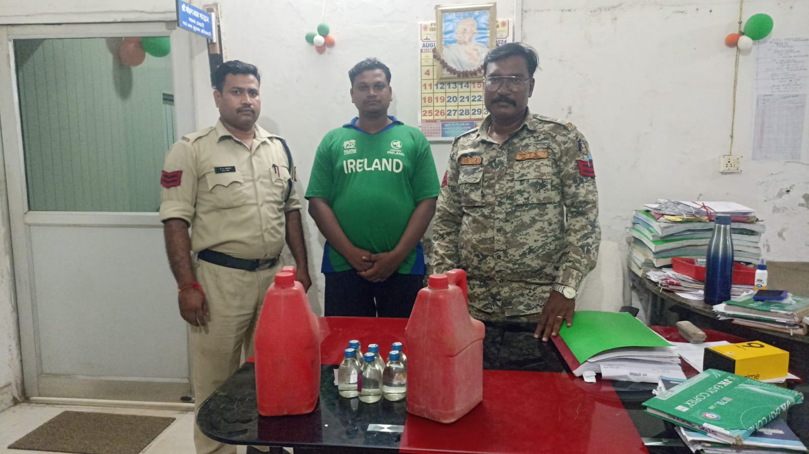 पुलिस ने घेराबंदी कर आरोपी को मौके पर पकड़ा और उसके पास से दो लाल रंग के 5-5 लीटर की प्लास्टिक जरिकन में भरी हुई हाथ भट्ठी की महुआ शराब और 06 नग देशी प्लेन मदिरा (180 ML) काँच की शीशियों में सीलबंद अवस्था में बरामद की गई।