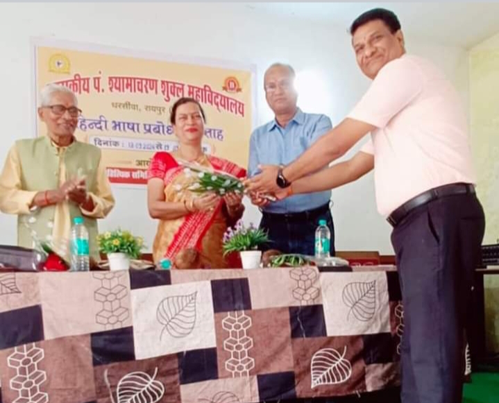 रायपुर । धरसींवा शासकीय पंडित श्यामाचरण शुक्ल महाविद्यालय के सभागार में हिंदी विभाग , साहित्यिक समिति तथा संकेत साहित्य समिति के संयुक्त तत्वावधान में हिंदी भाषा प्रबोधन सप्ताह के अंतिम दिन ‘हिंदी भाषा एवं रचनात्मक लेखन पर एक दिवसीय कार्यशाला का आयोजन किया गया। प्रमुख वक्ता थे भाषाविद तथा वरिष्ठ साहित्यकार डॉ . चितरंजन कर एवं सह वक्ता थे वरिष्ठ साहित्यकार एवं समीक्षक डॉ माणिक विश्वकर्मा’ नवरंग’। कार्यक्रम की शुरुआत में अपने स्वागत उद्बोधन के पश्चात हिंदी विभागाध्यक्ष कार्यक्रम संयोजक डॉ. सी.एल.साहू ने महाविद्यालय में दिनांक 13 सितम्बर से आरंभ हुए विभिन्न कार्यक्रमों यथा हिन्दी विषय में रोजगार की संभावनाएं ,हिंदी भाषा की उत्पत्ति – वक्ता राजस्थान विवि के सहायक आचार्य डॉ विशाल विक्रम सिंह ,हिंदी भाषा की उत्पत्ति ,विकास तथा वर्तमान परिदृश्य-वक्ता बलदाऊ राम साहू , छत्तीसगढ़ के विद्यार्थियों, शोधार्थियों तथा प्राद्यापकों और स्कूल के शिक्षकों हेतु , ‘राज्य स्तरीय हिंदी भाषा सामान्य ज्ञान प्रश्नोत्तरी प्रतियोगिता तथा महाविद्यालयों के नवोदित कवियों को प्रोत्साहित करने एक कविता हिंदी के नाम अभियान का ब्यौरा प्रस्तुत किया।अपने सारगर्भित उद्बोधन में विद्यालय की प्राचार्य डॉ. शबनूर सिद्दीकी ने हिंदी की महत्ता और उपयोगिता पर बात करते हुए इस आयोजन के माध्यम से पूरे छत्तीसगढ़ के छात्र – छात्राओं , प्राद्यापकों एवं साहित्यकारों को जोड़ने तथा काव्य प्रतिभा को अवसर प्रदान किये जाने पर आयोजन समिति को बधाई दी। हिंदी भाषा व्याकरण पर बात करते हुए मुख्य वक्ता डॉ. चितरंजन कर ने कहा हिंदी मात्र भाषा नहीं संस्कृति है। सह वक्ता डॉ माणिक विश्वकर्मा’ ‘नवरंग’ ने हिन्दी भाषा प्रगति एवं वैश्विक फलक पर प्रकाश डालते हुए कहा कि हिंदी समृद्ध, सशक्त एवं सरल भाषा है। दोनों वक्ताओं ने हिंदी भाषा के प्रति छात्र- छात्राओं में जागरूकता हेतु हिंदी – विभाग द्वारा चलाये जा रहे इस अभियान की प्रशंसा करते हुए आयोजन समिति तथा महाविद्यालय को बधाई दी और भविष्य में भी अपना सहयोग देने का आश्वासन दिया। हिंदी विभाग में भ्रमण के दौरान डॉ.कर ने विभाग को दस हजार की किताबें देने की घोषणा की। कार्यशाला के समापन पर