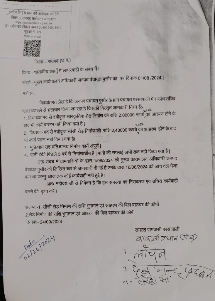 एक तरफ जहां प्रदेश की साय सरकार जीरो टॉलरेंस की नीति पर काम कर रही है दूसरी ओर पुसौर जनपद के ग्राम पंचायत परसापाली में सरपंच घुराऊ गढ़वाल एवं सचिव सुदर्शन कर्ष के द्वारा खुलेआम भ्रष्टाचार करके उनकी नीतियों की धज्जियां उड़ाई जा रही है जिसकी शिकायत ग्रामवासियों ने कलेक्टर जनदर्शन में किया है।