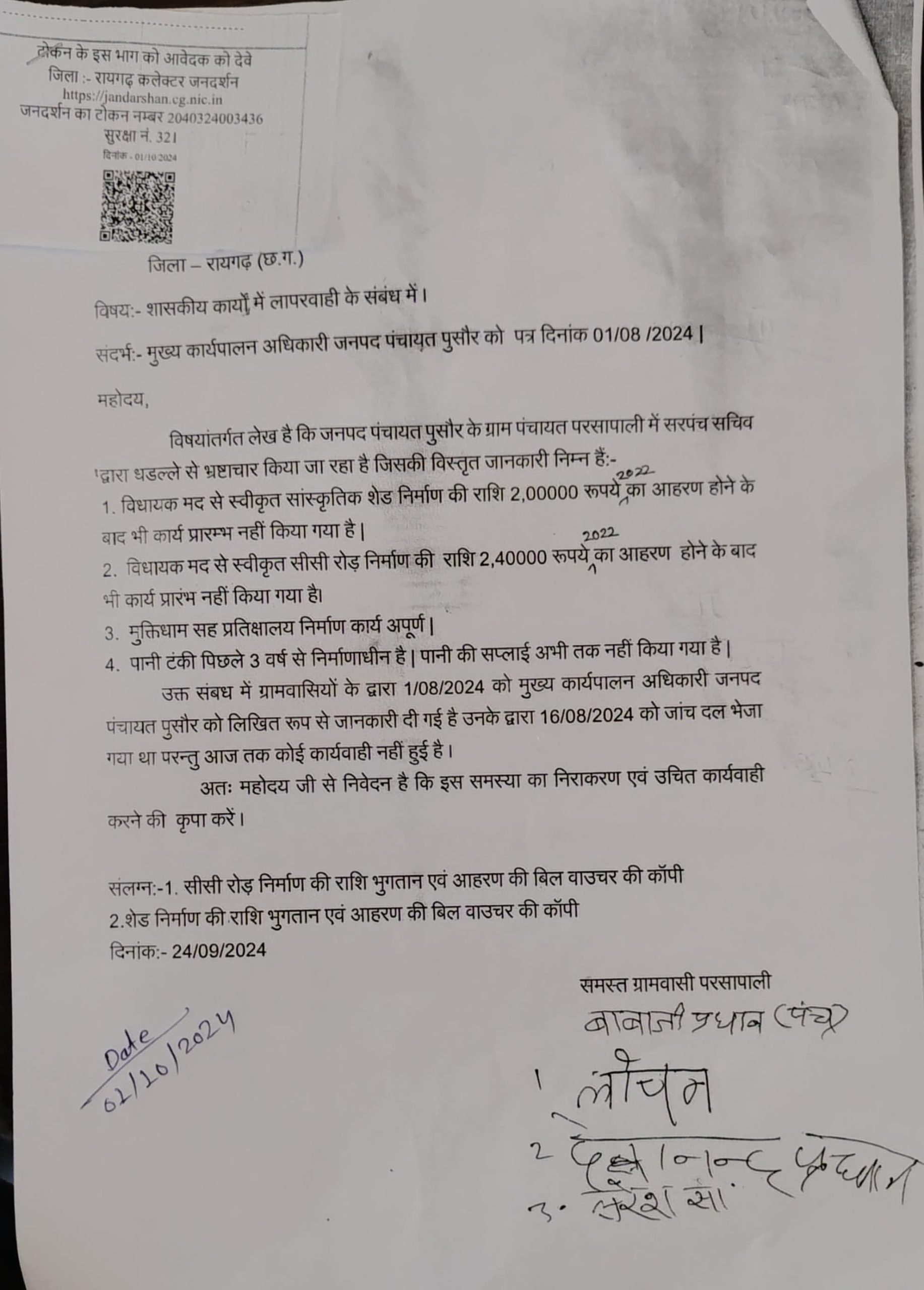 रायगढ़:-पुसौर जनपद पंचायत के अंतर्गत आने वाले ग्राम पंचायत परसापाली के ग्रामीणों ने किया कलेक्टर जनदर्शन में भ्रष्ट सरपंच सचिव के खिलाफ किया शिकायत।