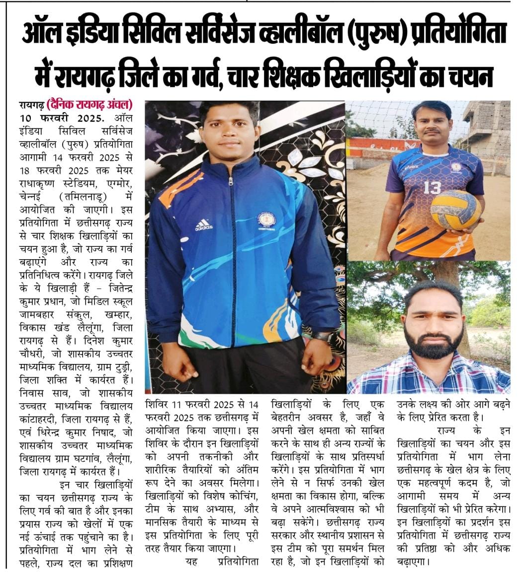 ऑल इंडिया सिविल सर्विसेज व्हालीबॉल (पुरुष) प्रतियोगिता में रायगढ़ जिले का गर्व: चार शिक्षक खिलाड़ियों का चयन