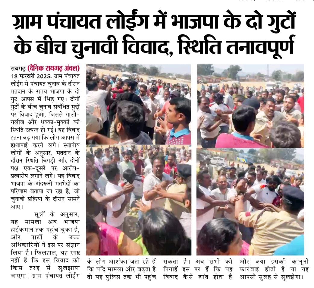 ग्राम पंचायत लोईंग में भाजपा के दो गुटों के बीच चुनावी विवाद, स्थिति तनावपूर्णरायगढ़ — ग्राम पंचायत लोईंग में पंचायत चुनाव के दौरान मतदान के समय भाजपा के दो गुट आपस में भिड़ गए। दोनों गुटों के बीच चुनाव संबंधित मुद्दों पर विवाद हुआ, जिससे गाली-गलौज और धक्का-मुक्की की स्थिति उत्पन्न हो गई। यह विवाद इतना बढ़ गया कि लोग आपस में हाथापाई करने लगे। स्थानीय लोगों के अनुसार, मतदान के दौरान स्थिति बिगड़ी और दोनों पक्ष एक-दूसरे पर आरोप-प्रत्यारोप लगाने लगे। यह विवाद भाजपा के अंदरूनी मतभेदों का परिणाम बताया जा रहा है, जो चुनावी प्रक्रिया के दौरान सामने आए।सूत्रों के अनुसार, यह मामला अब भाजपा हाईकमान तक पहुंच चुका है, और पार्टी के उच्च अधिकारियों ने इस पर संज्ञान लिया है। फिलहाल, यह स्पष्ट नहीं है कि इस विवाद को किस तरह से सुलझाया जाएगा। ग्राम पंचायत लोईंग के लोग आशंका जता रहे हैं कि यदि मामला और बढ़ता है तो यह पुलिस तक भी पहुंच सकता है। अब सभी की निगाहें इस पर हैं कि यह विवाद कैसे शांत होता है और क्या इसकी कानूनी कार्रवाई होती है या यह आपसी सुलह से सुलझेगा।