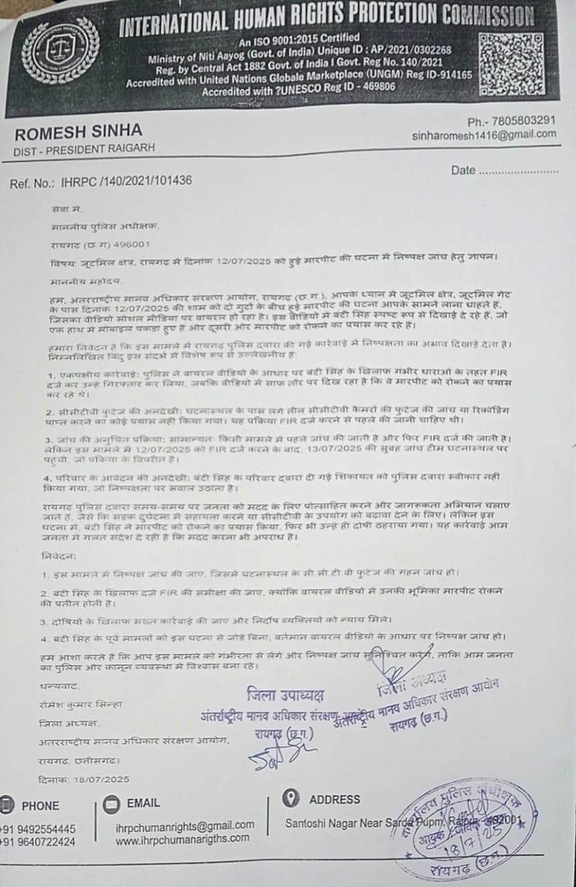 रायगढ़ :- जूटमिल क्षेत्र में 12 जुलाई 2025 की शाम को दो गुटों के बीच हुई मारपीट की घटना को लेकर अंतरराष्ट्रीय मानव अधिकार संरक्षण आयोग, रायगढ़ ने पुलिस अधीक्षक को ज्ञापन सौंपकर निष्पक्ष जांच की मांग की है। इस घटना का एक वीडियो सोशल मीडिया पर वायरल हो रहा है, जिसमें बंटी सिंह नामक व्यक्ति मारपीट को रोकने का प्रयास करते दिखाई दे रहे हैं। आयोग का आरोप है कि रायगढ़ पुलिस ने इस मामले में एकपक्षीय कार्रवाई करते हुए बंटी सिंह के खिलाफ गंभीर धाराओं में FIR दर्ज कर उन्हें गिरफ्तार कर लिया, जबकि वीडियो में उनकी भूमिका मारपीट रोकने की प्रतीत होती है।