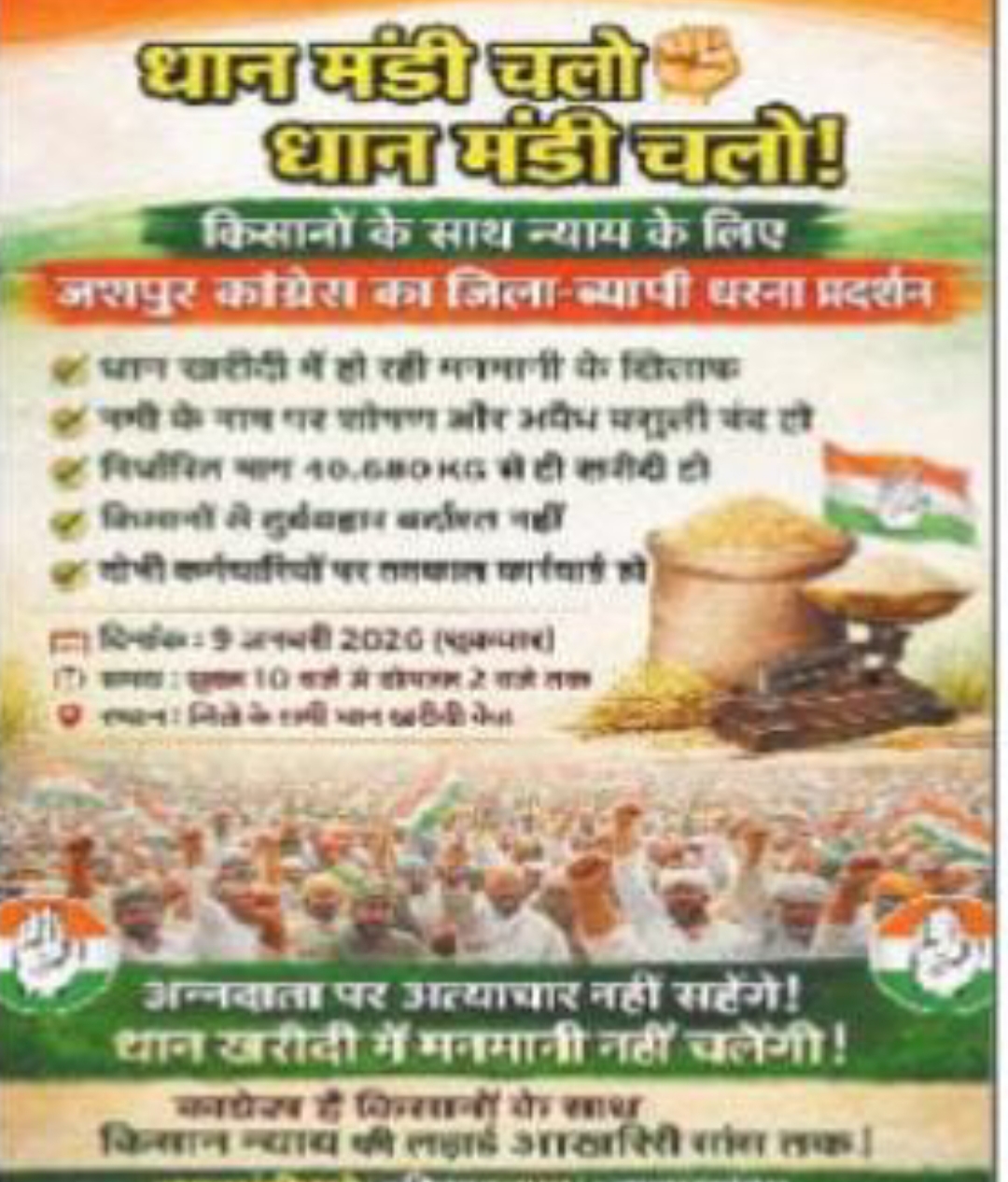 कांग्रेस ने साफ किया है कि 9 जनवरी का धरना प्रदर्शन पूरी तरह शांतिपूर्ण रहेगा लेकिन यदि किसानों की मांगों को गंभीरता से नहीं लिया गया तो आंदोलन को और तेज किया जाएगा। पार्टी ने कहा है कि अन्नदाता के साथ हो रहे अन्याय को किसी भी कीमत पर बर्दाश्त नहीं किया जाएगा और किसान न्याय की यह लड़ाई आखिरी दम तक लड़ी जाएगी।