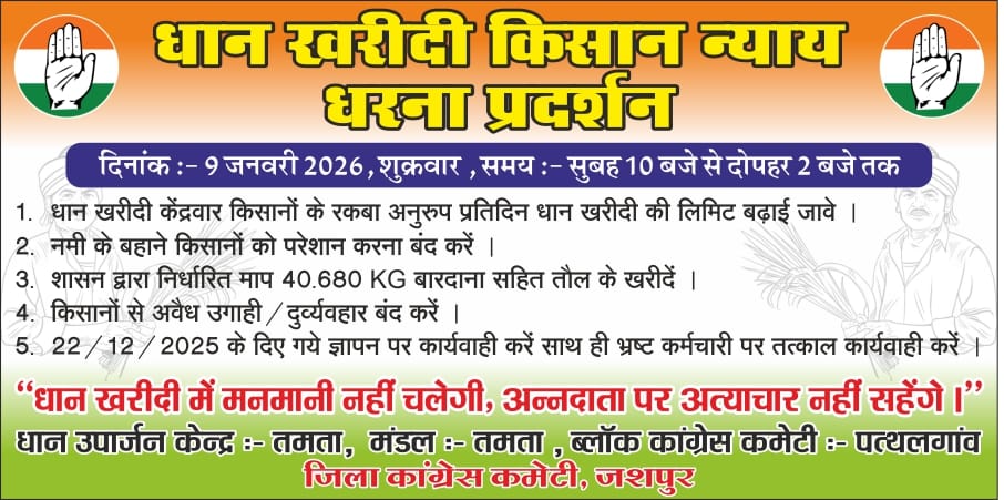 पत्थलगांव धान खरीदी में कथित मनमानी अवैध वसूली और किसानों से हो रहे दुर्व्यवहार के विरोध में जशपुर जिला कांग्रेस कमेटी 9 जनवरी शुक्रवार को जिले भर में बड़ा आंदोलन करने जा रही है। कांग्रेस ने घोषणा की है कि जिले के सभी 46 धान खरीदी केंद्रों में एक साथ सुबह 10 बजे से दोपहर 2 बजे तक धरना प्रदर्शन किया जाएगा।